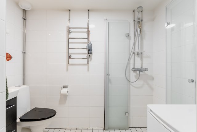 - Suihku, suihkuseinä, pesukoneliitäntä, lattialämmitys, peilikaappi, pesuallas, allaskaappi, bidee-suihku, ja pyyhepatteri