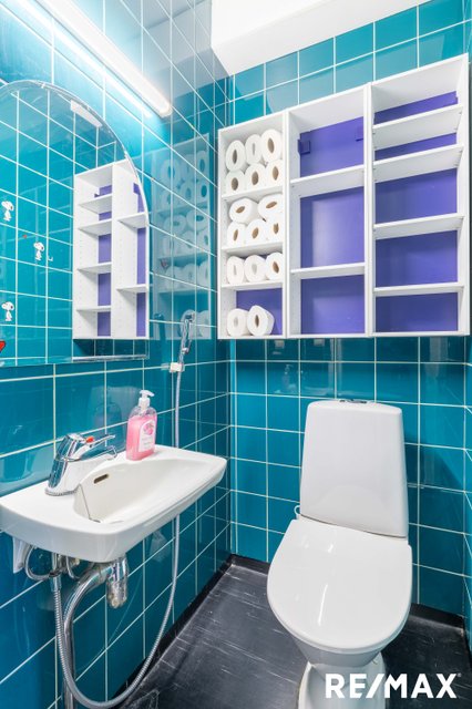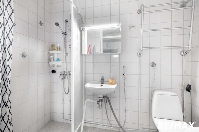 - WC-istuin, suihkuseinä, pesukoneliitäntä, peilikaappi, bidee-suihku, ja pyyhekuivain