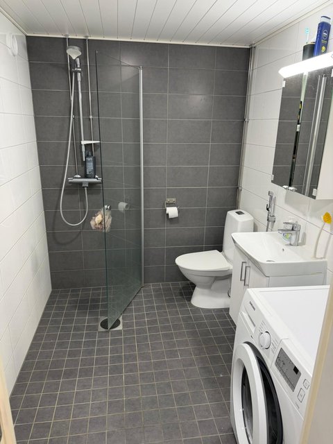 - Hyvän kokoinen vaalea kylpyhuone, jossa upea harmaa tehosteseinä. Kylpyhuone on juuri remontoitu linjasaneerauksen yhteydessä.