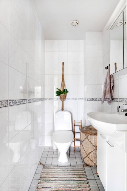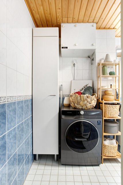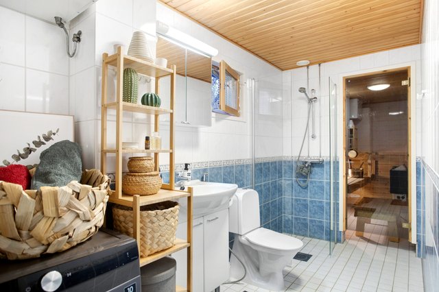 - WC-istuin, suihku, pesukoneliitäntä, lattialämmitys, peilikaappi, ja pesuallas