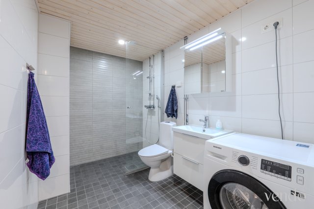 - WC-istuin, suihku, suihkuseinä, pesukoneliitäntä, lattialämmitys, peilikaappi, peili, pesuallas, allaskaappi, ja bidee-suihku