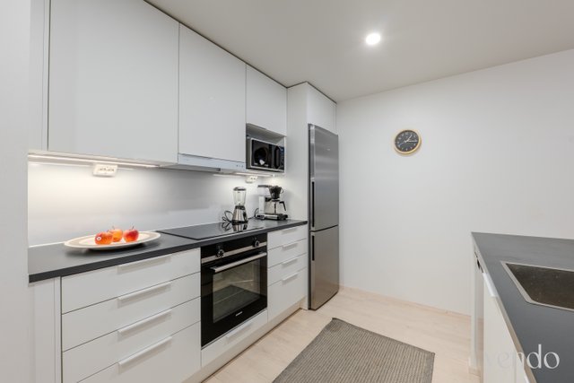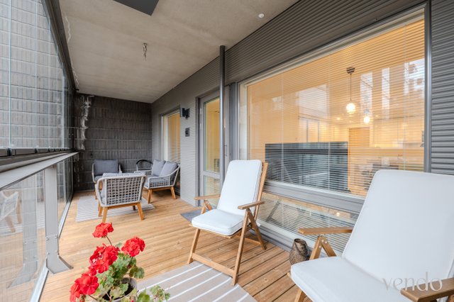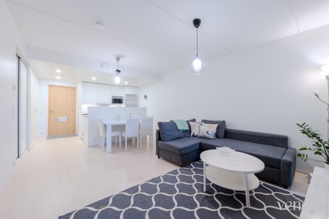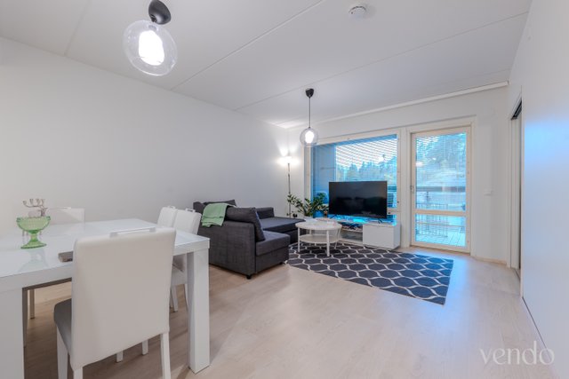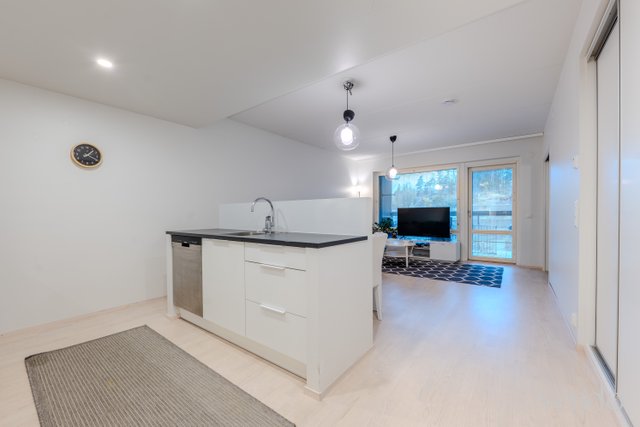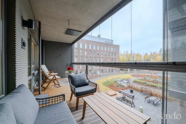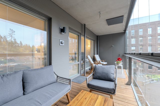 Asunnon kolmas kerros tarjoaa mukavat näkymät lasitetulta parvekkeelta, ja tilava olohuone sekä avokeittiö tekevät tästä kodista viihtyisän paikan asua. Keittiössä on kaikki tarvittavat mukavuudet sekä keittiö saareke joka tuo mukavasti laskutilaa.