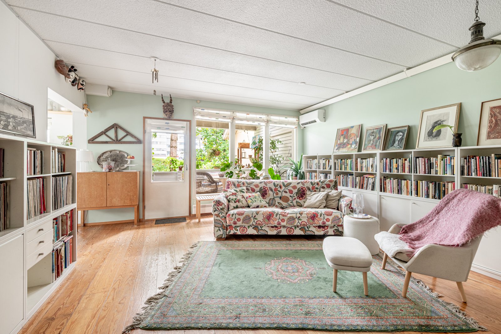 - Valoisa olohuone keskikerroksessa, jonka yhteydessä käynti terassille.