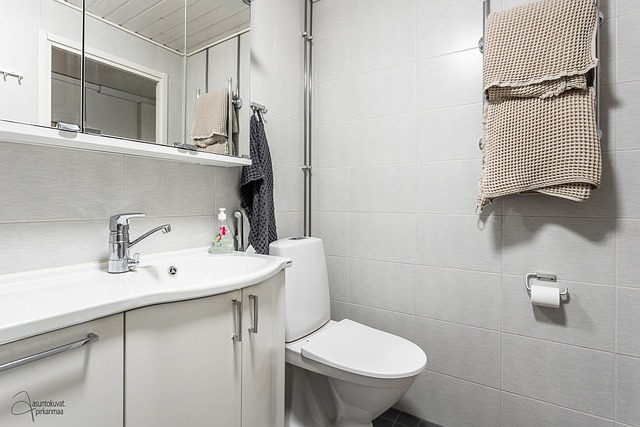 - Lattia ja seinät laatoitettu. Suinku, suihkuseinä, pesukoneliitäntä, peilikaappi, allaskalusto, hana, bidee-hana, wc-istuin, pyyhekuivain.