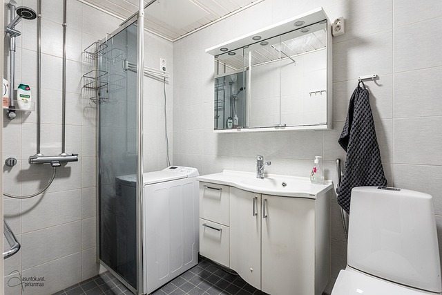 - Lattia ja seinät laatoitettu. Suihku, suihkuseinä, pesukoneliitäntä, peilikaappi, allaskalusto, hana, bidee-hana, wc-istuin.