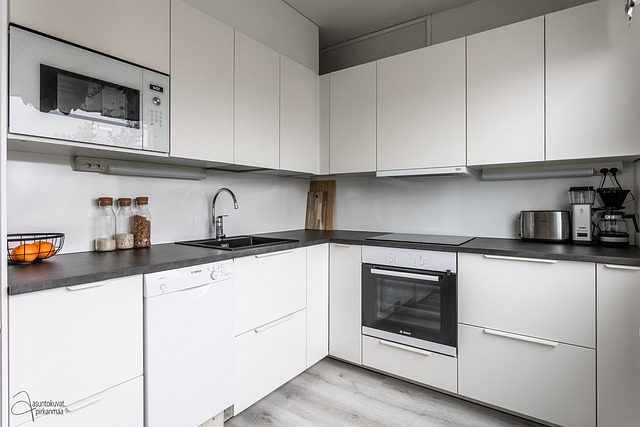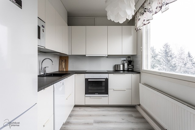 - Lattia laminaattia, seinät maalattua. Jääkaappi, pakastin, uuni, keraaminen liesi, pesuallas, hana, astianpesukone, integroitu mikro.