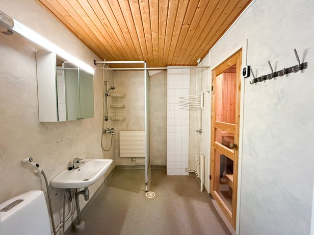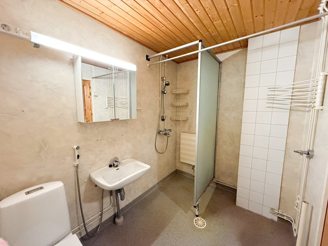 - WC-istuin, suihku, suihkuseinä, pesukoneliitäntä, ja peilikaappi
