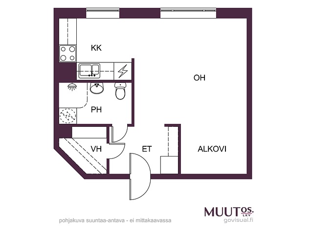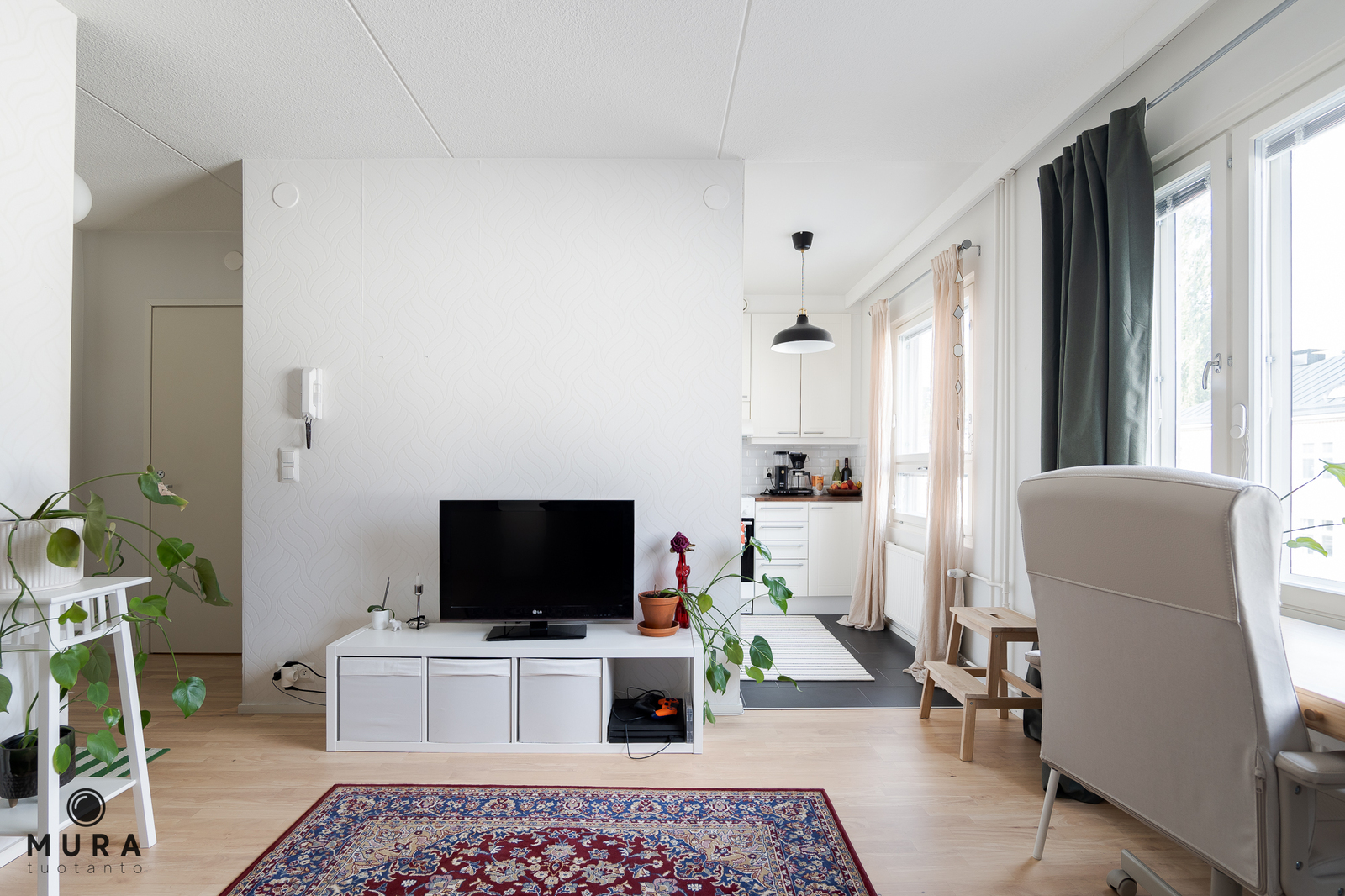 - Pinta-ala ei ole tarkistusmitattu. Hinta ei ole pinta-alaperusteinen. Huoneiston pinta-ala on yhtiöjärjestyksen, isännöitsijäntodistuksen ja myyjän ilmoituksen mukaan 29,5 m2. Edellä mainittu pinta-ala saattaa tämän ikäisessä kohteessa poiketa olennaisestikin huoneiston nykyisen ja rakentamisaikaisen mittaustapojen ja standardien mukaan laskettavasta pinta-alasta. Huoneiston todellinen pinta-ala voi siis olla yhtiöjärjestyksessä, isännöitsijäntodistuksessa ja esitteessä mainittua pienempi tai suurempi. Myynnissä ja markkinoinnissa käytetty huoneistoselitelmää 1h, alkovi, k, kph. Yhtiöjärjestyksen mukaan huoneistoselitelmä on 1h+kk.