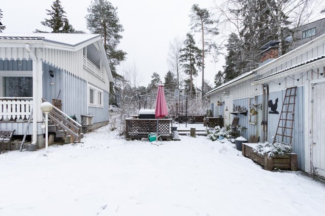 Ulkotiloista löytyy parveke, autotalli ja varastotilaa. Koko 1072 neliömetrin tontti on oma, ja sen rajalla on valokuituyhteys. Talon katto on uusittu hiljattain vuonna 2023, joten se on hyvässä kunnossa.