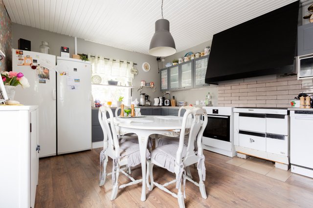 - Jääkaappi, erillinen pakastin, astianpesukone, liesi, ja huuva