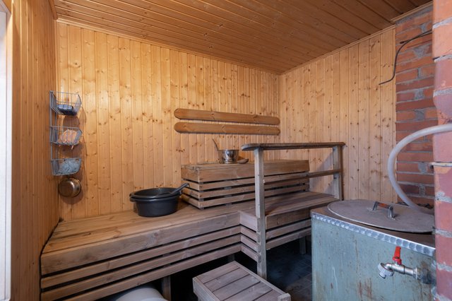 - Sisällä sähkökiuas. Ulkosaunassa puukiuas