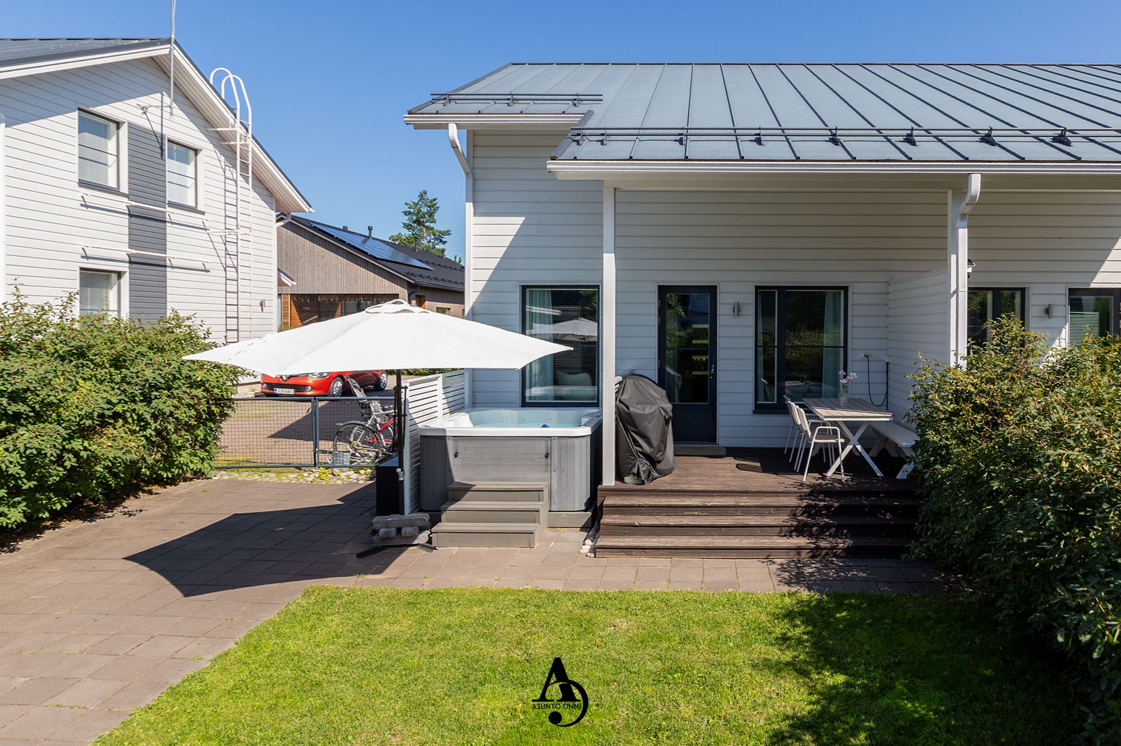 Kodin valoisa ja tilava olohuone avautuu suojaisalle takapihalle, jossa on myös katettu terassi ja ympäri vuoden käytettävä poreamme. Tyylikäs keittiö on varustettu laadukkailla kodinkoneilla ja tarjoaa tilaa ruokailuryhmälle. Kaksi yläkerran makuuhuonetta tarjoavat rauhalliset puitteet levolle, ja suuremmassa makuuhuoneessa on kaapistot säilytystilaa varten.