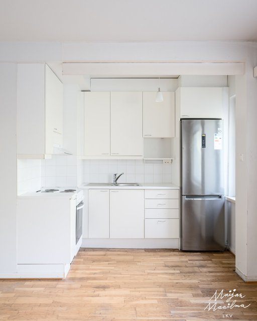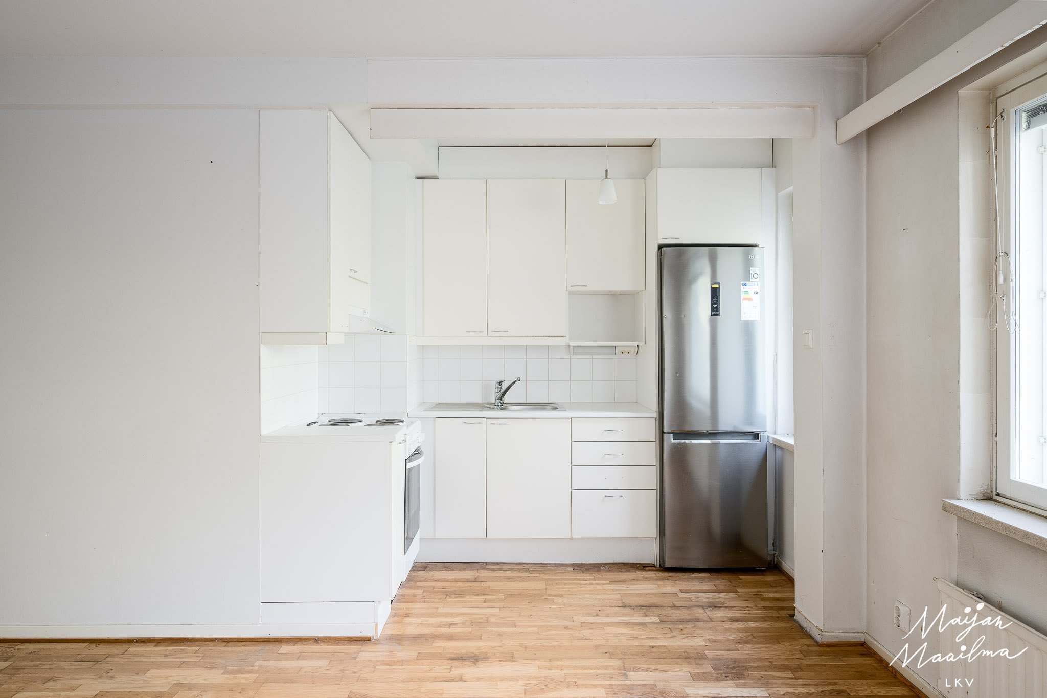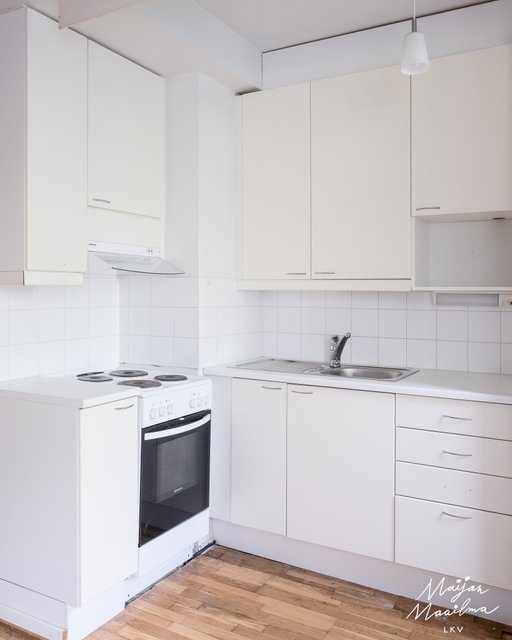 - Avokeittiö: Parkettilattia, maalatut seinät. Valkoiset kaapistot. Uuni, liesi, liesituuletin ja jääkaappi-pakastin.