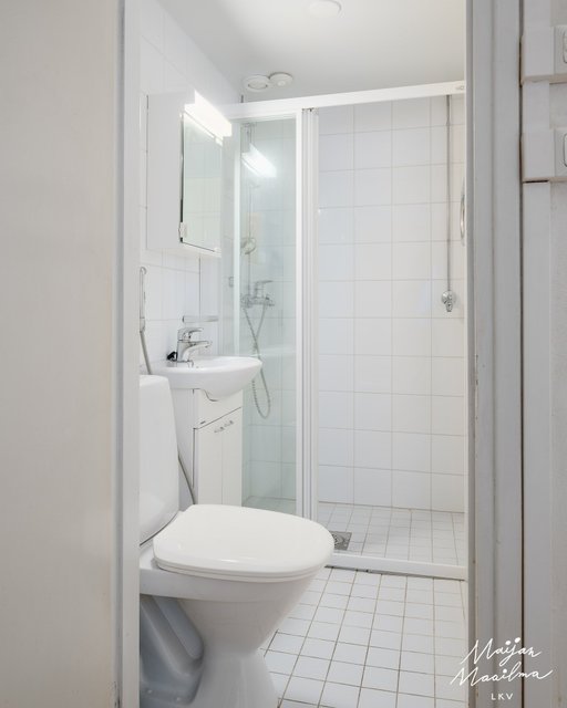 - Kylpyhuone/wc: Seinät ja lattia laatoitettu. Suihku, suihkuseinä, allas, allashana, bideesuihku, allaskaappi ja peilikaappi. Pesukoneliitäntä. Wc-istuin, pyyhepatteri.