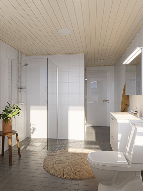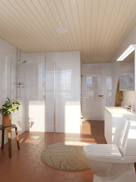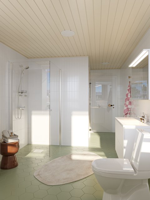 - Valoisa kylpyhuone, jossa tilavaraus pesutornille sekä rentoutukseen oma sauna.