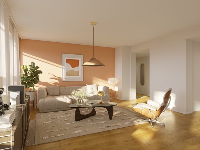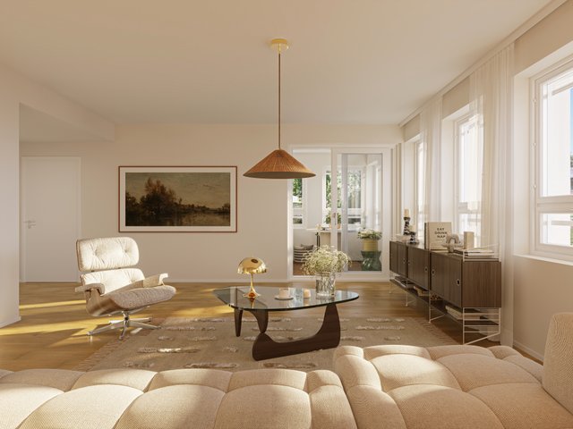 - Valoisa olohuone, jonka seinustaa rytmittää kauniit ikkunat 50-luvun henkeen. Monipuolisesti kalustettavissa, tähän huoneeseen mahtuu sohvaryhmän lisäksi halutessasi myös suuri ruokailuryhmä täydentämään keittiön ruokailupistettä.