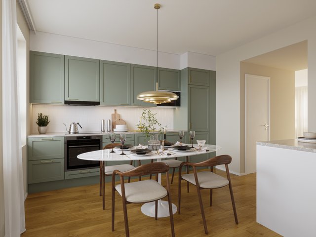 - Erillinen valoisa keittiä, johon mahtuu hyvin ruokailuryhmä. Varsinaisen keittiön kaapiston vastapuolelta löytyy myös 90 cm korkea kaapisto esim. kattaukselle tai asetelmille ja lisäsäilytykseen.