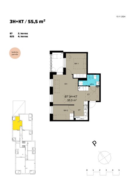 Huoneisto B 25 on tämän talon ylimmän kerroksen huoneisto, jossa lasitettu parveke yhtiön sisäpihan suuntaan.
