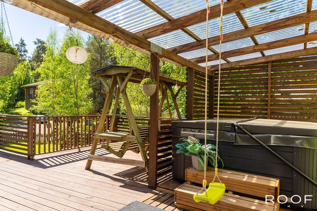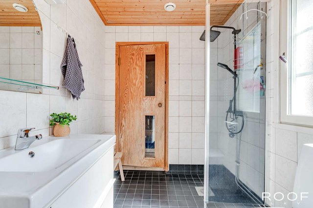 Kodin alakerrasta löytyvät keittiö, tilava olohuone, yksi makuuhuone sekä saunaosasto, jossa on myös käytännölliset kodinhoitotilat. Saunasta on käynti suurelle terassille, jonka kruunaa poreamme – täydellinen paikka rentoutumiseen.