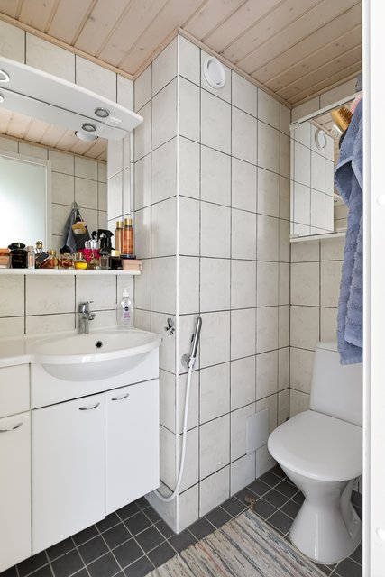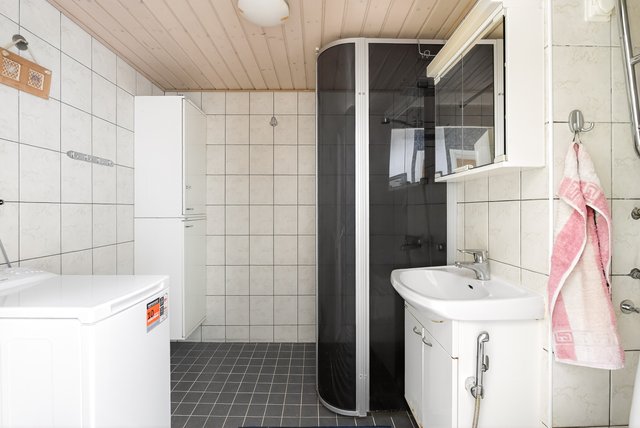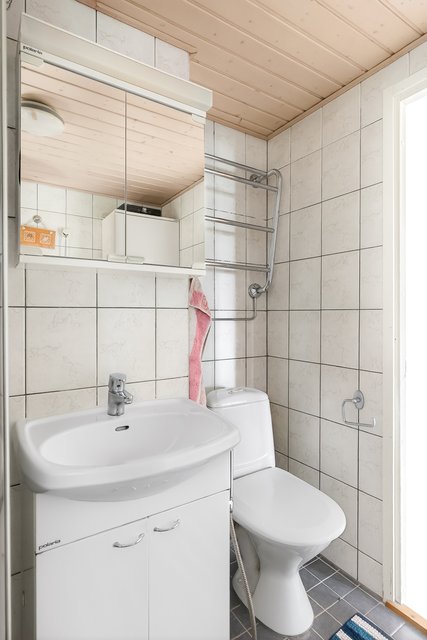- Suihku, suihkuseinä, pesukoneliitäntä, peilikaappi, pesuallas, allaskaappi, wc-istuin, ja kaappi