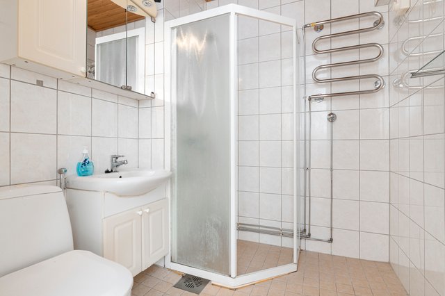 - WC-istuin, peilikaappi, suihkukaappi, pesukoneliitäntä, peili, bidee-suihku, suihku, ja rättipatteri