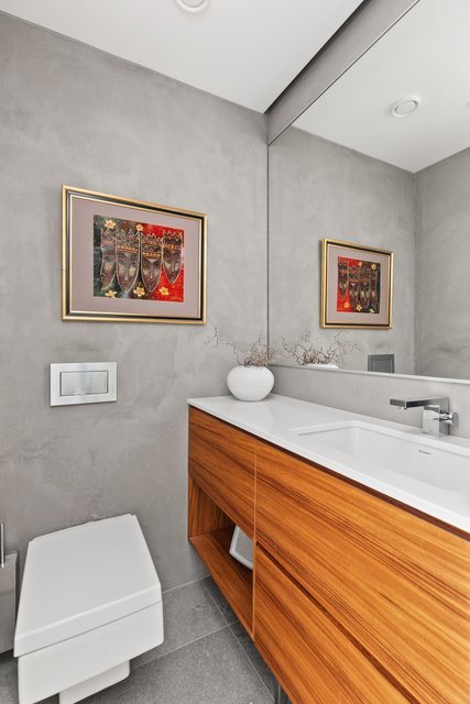 - Alakerrassa erillinen wc, jossa seinä-wc, allaskaapisto, valaistu peili.