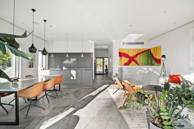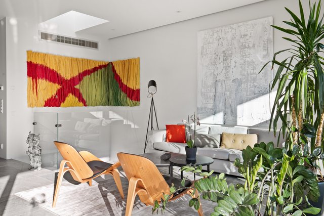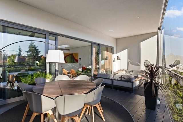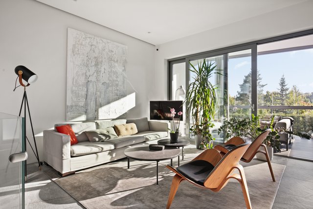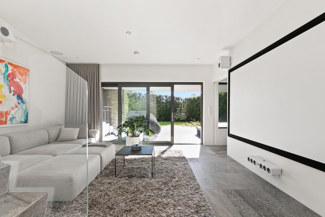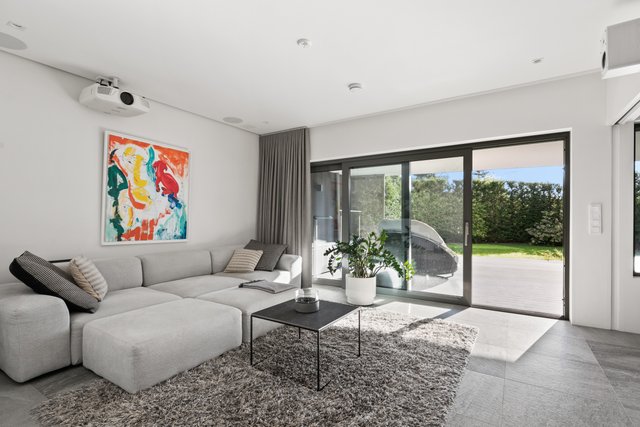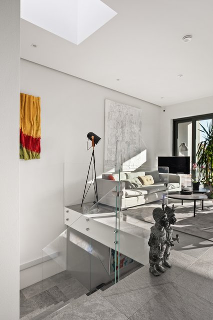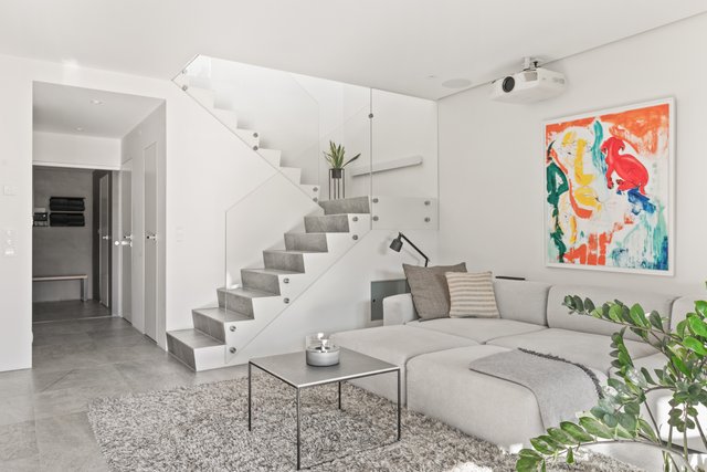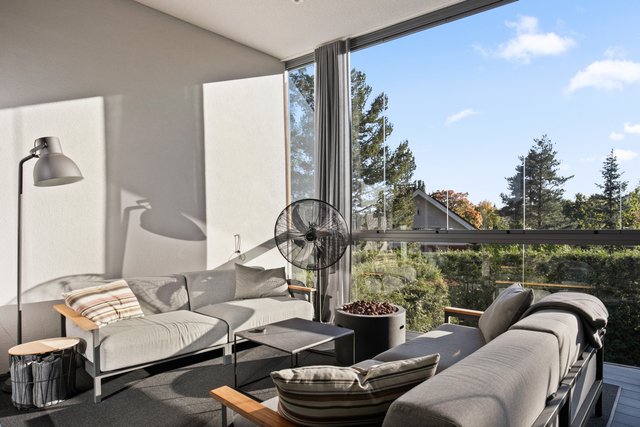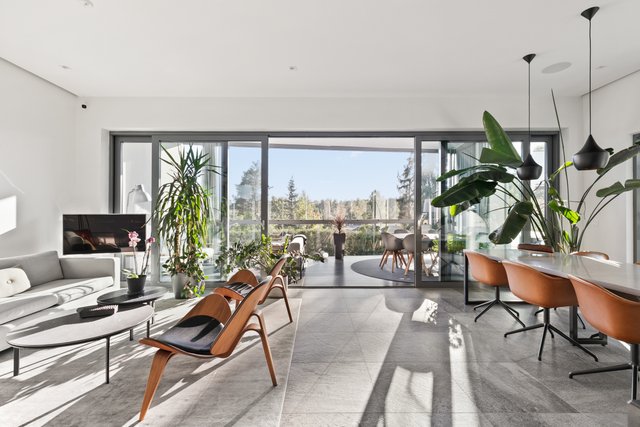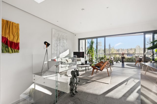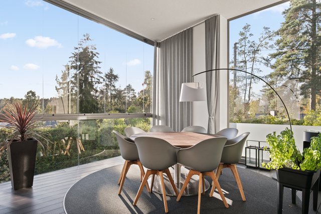 - Iso valoisa olohuone, jossa koko seinän korkuiset ja leveät lasiovet avautuvat upealle yli 30 neliön lasitetulle terassiparvekkeelle. Olohuone, ruokailutila ja keittiö muodostavat yhteinäisen oleskelutilan. Olohuoneen valaistus on suunnitteltu niin että katonrajassa on koko seinän levyinen himmennettävä valaisin ja lisäksi eri ryhmissä syttyviä valaistuskokonaisuuksia spottivalaisimilla. Alakerrassa on upea arkiolohuone, jossa isot koko seinän korkuiset liukuovet terassille. Pimentävät verhot mittatilaustyönä (myydään erikseen).