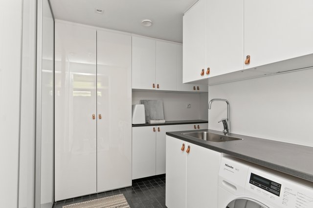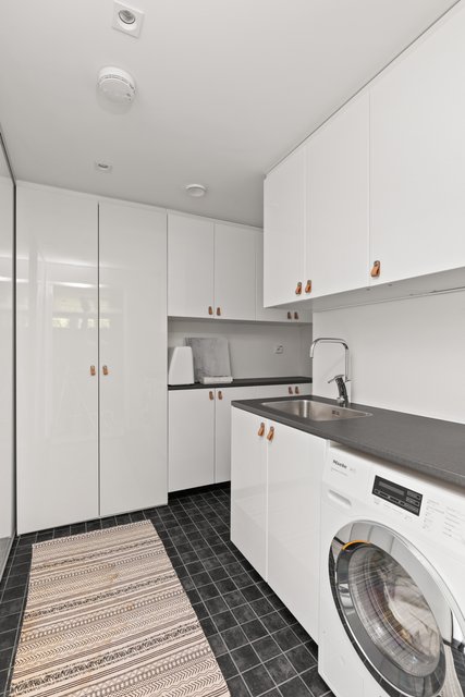 - Lattialämmitys, pesuallas, lattiakaivo, pyykkikaapit, tila pesutornille, pesukoneliitäntä, ja pöytätaso