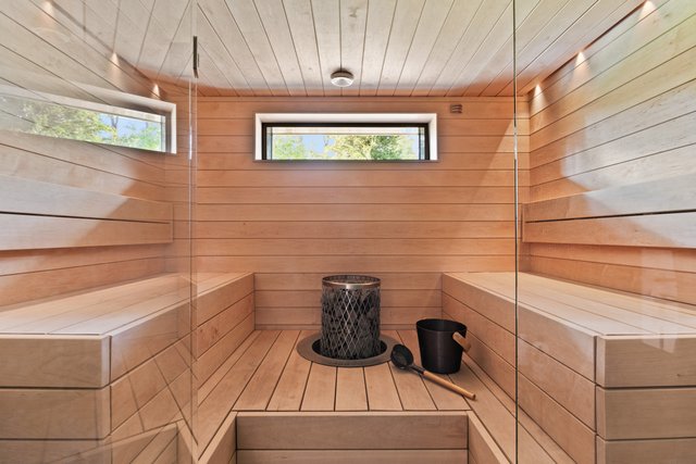 - Ikkunallinen sauna, IKI-pylväskiuas, täyskorkea lasiseinä, lauteet haapaa, seinät paneloitu, led-valot.