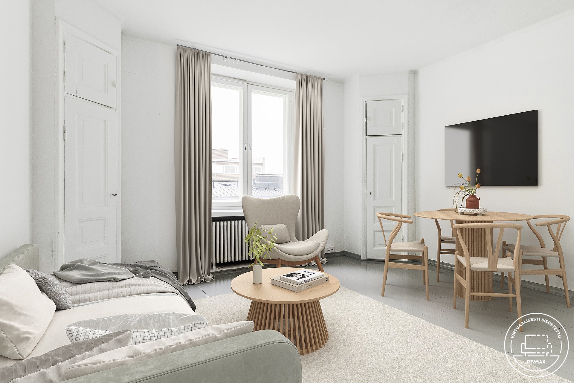 Tämä kolmannen kerroksen yksiö hurmaa heti ensisilmäyksellä selkeydellään, klassisella ilmeellään ja lempeällä värimaailmallaan. Kodin tunnelma on rauhallinen ja valoisa. Vaaleat seinät, hohtavan harmaaksi maalattu lautalattia sekä isot ikkunapuitteet luovat kotiin vanhaa, idyllistä tunnelmaa.