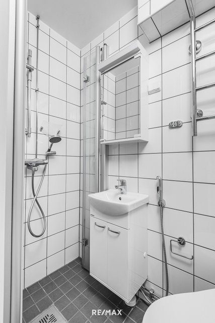 Kylpyhuone on remontoitu ja nykyaikainen: valkoiset seinälaatat, hillitty lattialaatta sekä suihkuseinä tuovat tilaan raikkautta ja käytännöllisyyttä. Lattialämmitys lisää arjen mukavuutta.
