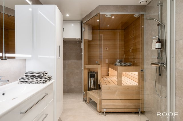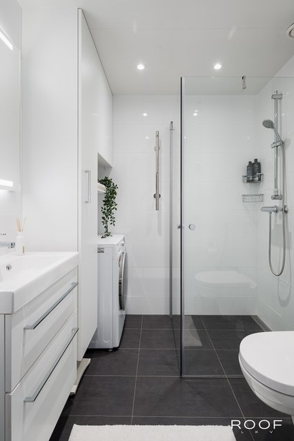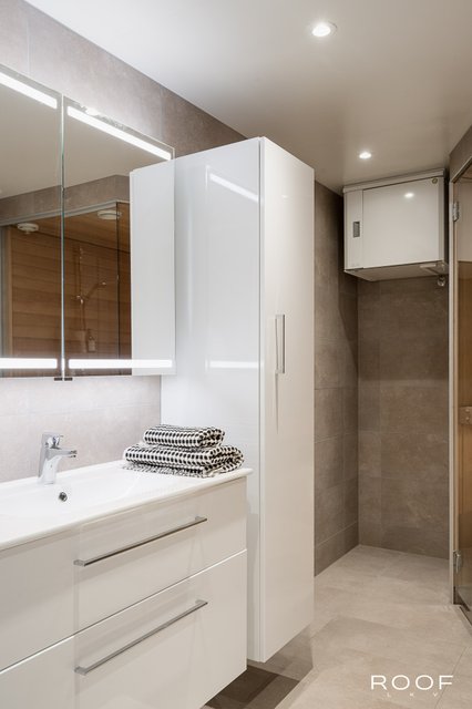- WC-istuin, bidee-suihku, pesuallas, allaskaappi, peili, pesukoneliitäntä, lattialämmitys, suihku, suihkuseinä, ja pyyhepatteri, kaappi