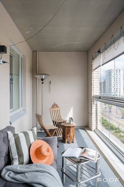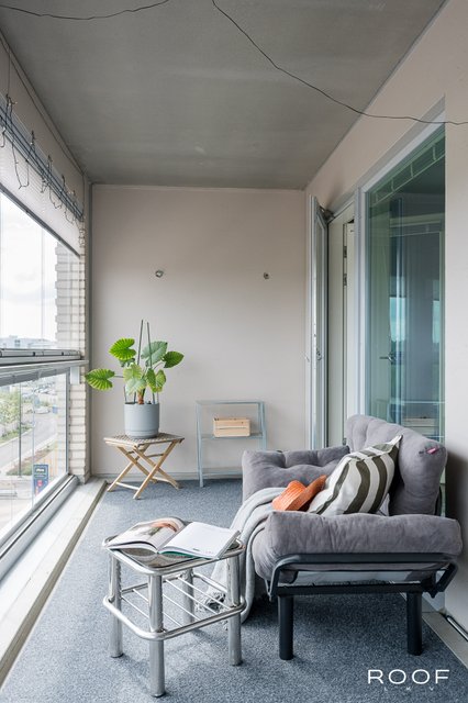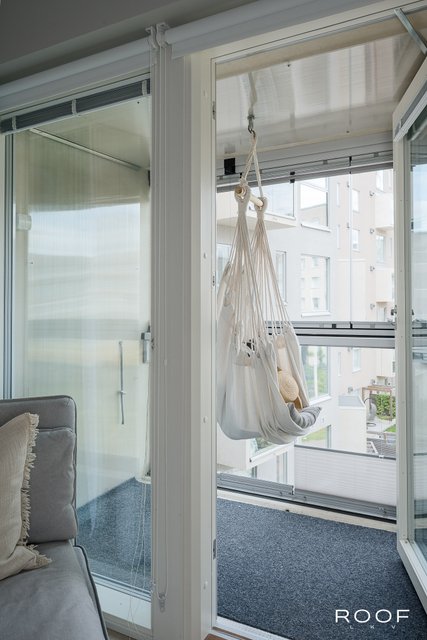 - Kolmion olohuoneesta käynti isolle lasitetulle parvekkeelle.