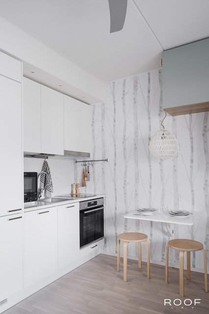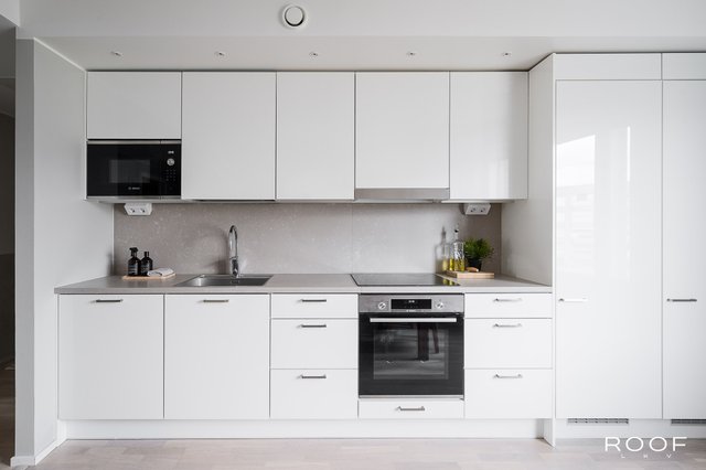 - Keittiö kolmion puolella: Varustus: Integroidut kodinkoneet, erillisuuni, induktioliesitaso, liesituuletin, mikroaaltouuni, astianpesukone, jääkaappi, pakastekaappi. Pöytätäasot: kivi Avokeittiö yksiön puolella: Varustus: Integroidut kodinkoneet, erillisuuni, induktioliesitaso, liesituuletin, astianpesukone, jääkaappi/pakastin. Pöytätäasot: kivi