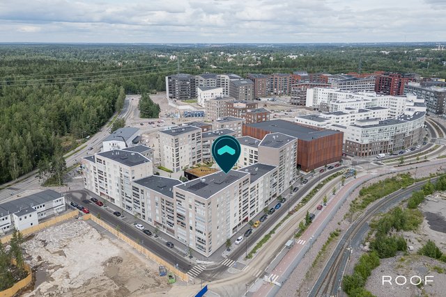 Kolmion puolella olohuone ja keittiö muodostavat avaran ja valoisan kokonaisuuden, josta on käynti suurelle lasitetulle parvekkeelle. Sieltä avautuvat huikeat näkymät yli ratapihan kohti Pasilan torneja, Linnanmäkeä ja aina Kalasatamaan asti. Päämakuuhuoneessa on tilava vaatehuone ja toisessa makuuhuoneessa kaapistot. Tyylikkään kylpyhuoneen yhteydessä on moderni lasiseinäinen sauna. Yksiön puolella on kompakti huonetila sänkysyvennyksellä ja pienellä avokeittiöllä, oma kylpyhuone pyykkikoneen paikkoineen sekä rauhalliselle sisäpihalle avautuva lasitettu parveke. Huoneistolle kuuluu samassa kerroksessa sijaitseva lämmin varasto, ja yhtiöjärjestyksen perusteella huoneistolla on etulyöntiasema yhtiön autopaikkoihin viereisessä pysäköintihallissa.