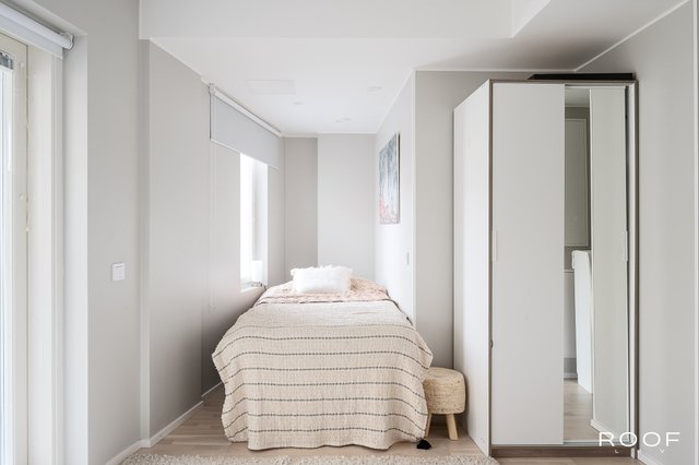 - Kolmion puolella päämakuuhuoneen yhteydessä vaatehuone ja pienemmän makuuhuoneen yhteydessä liukuovikaapisto. Yksiön puoella kolmas makuuhuone, jonka yhteydessä keittotaso, oma lasitettu parveke sisäpihan puolelle, eteistila liukuovikaapistolla sekä kylpyhuone.