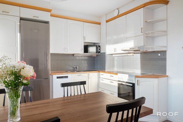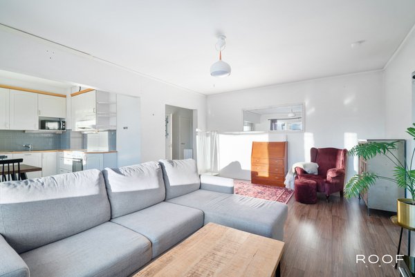 Tilavan olohuoneen yhteydessä avokeittiö, mihin mahtuu isokin ruokapöytä.