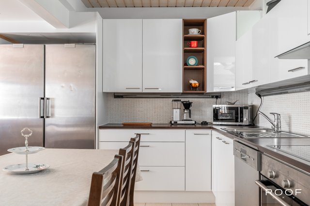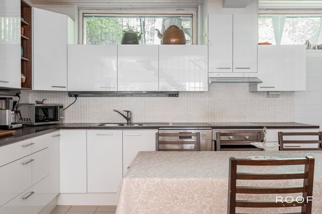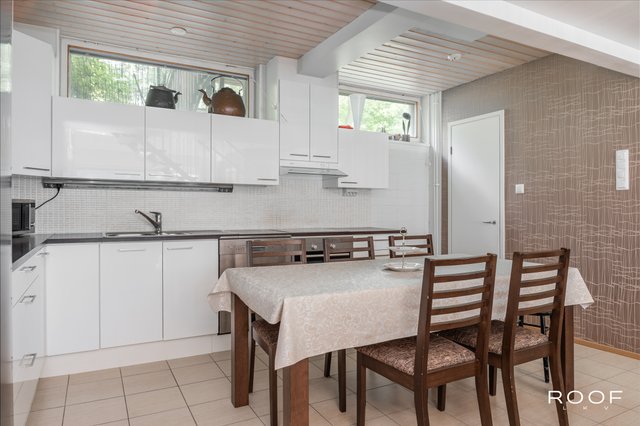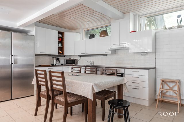- Ala Carten keittiö. Varustus: jääkaappi, pakastin, astianpesukone, kiinteät valaisimet, liesituuletin / hormi. Liesi: keraaminen, erillisuuni. Työtasot: puu. Lattia: laatta. Seinät: tapetti, osalaatoitus, lattialämmitys.