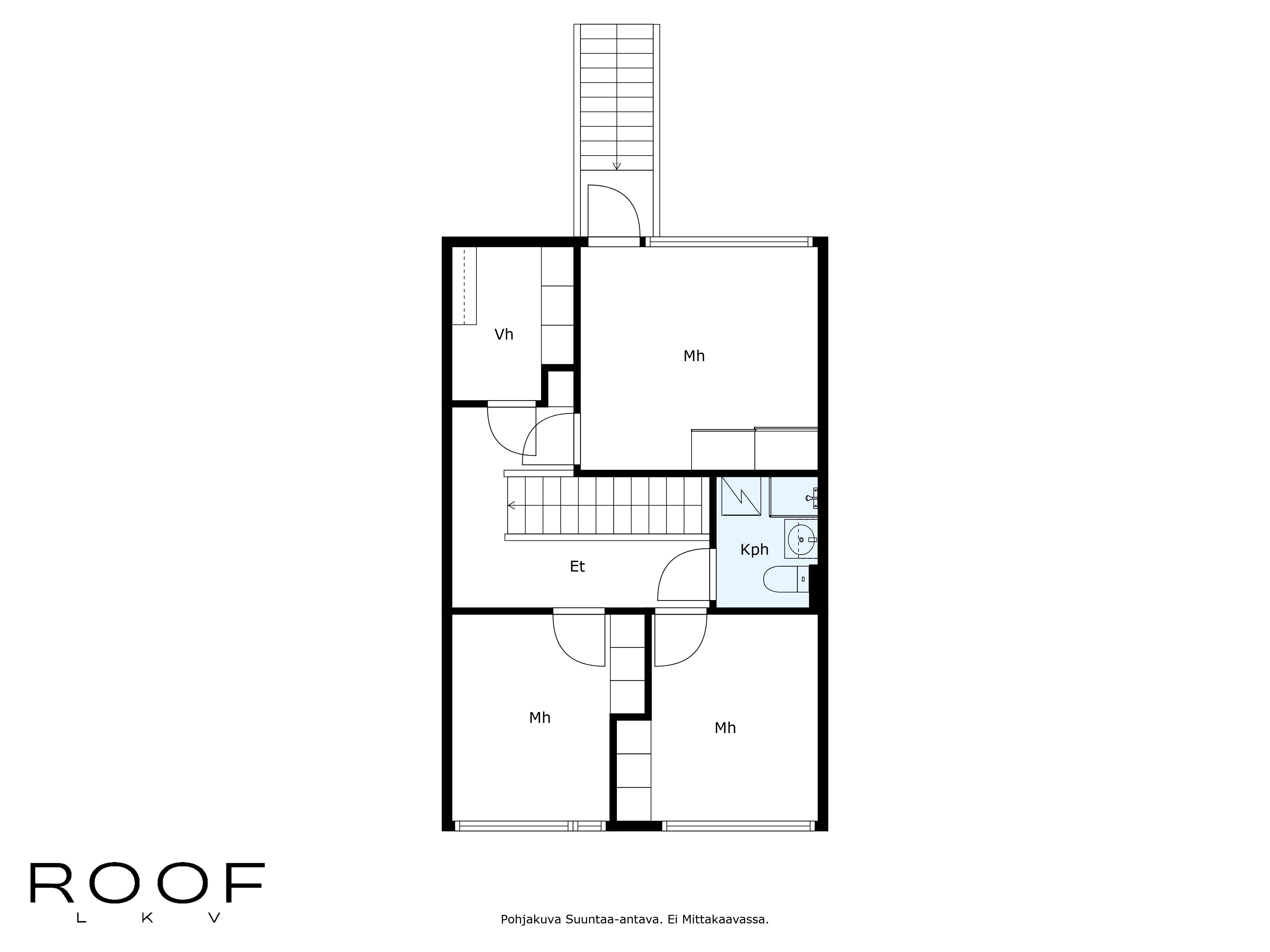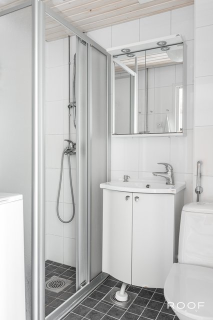 - Varustus: suihkuseinä, pesukoneliitäntä, lattialämmitys, wc-istuin, suihku, peilikaappi, kiinteät valaisimet, kylpyhuonekaapisto. Lattia: laatta. Seinät: kaakeli.