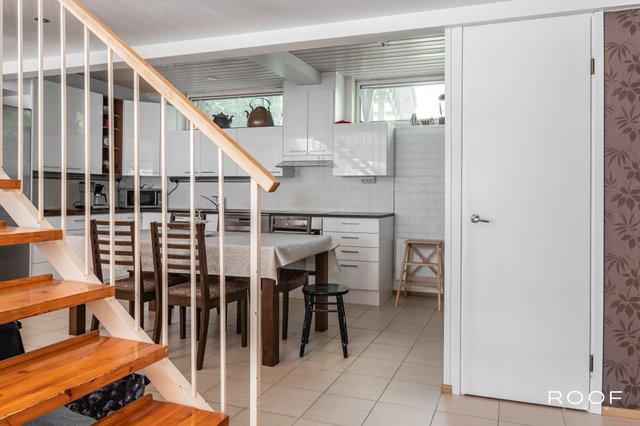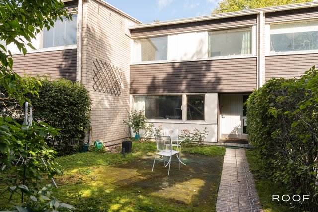 Nyt myynnissä olevalla 94 m2 huoneistolla on viihtyisä piha talon molemmilla puolilla. Asunnon alakerrassa on valoisa olohuone, tilava avokeittiö ruokailutiloineen sekä wc. Yläkerrassa on kolme makuuhuonetta, kylpyhuone ja vaatehuone. Yhdestä makuuhuoneesta pääsee omalle takapihalle. Asunnon keittiö on uusittu vuonna 2010, jolloin myös koko alakerran sähköt uusittiin. Kylpyhuone ja wc uusittiin talon putkiremontin yhteydessä vuonna 2009, jolloin myös talon ilmanvaihto ja sähköjärjestelmä modernisoitiin. Asukkaiden käytössä on sauna ja jokaiselle asunnolle kuuluu autotallipaikka.