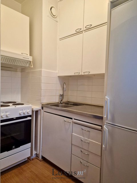 - Varustus: Valkoiset kaapistot. Jääkaappi/pakastin, kalusteuuni, liesi, liesituuletin.