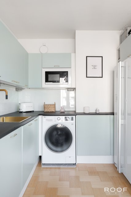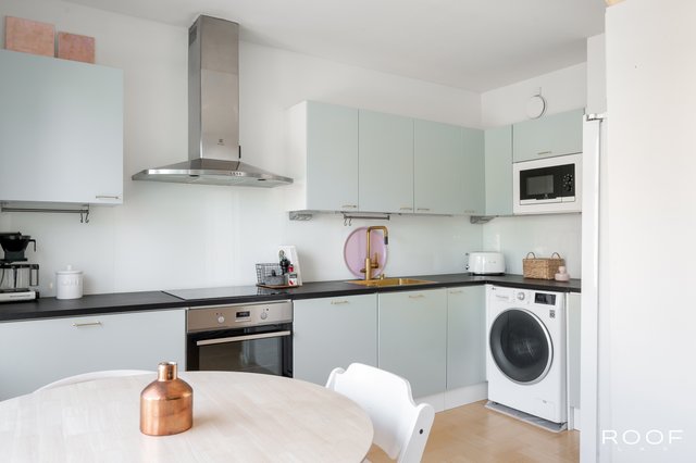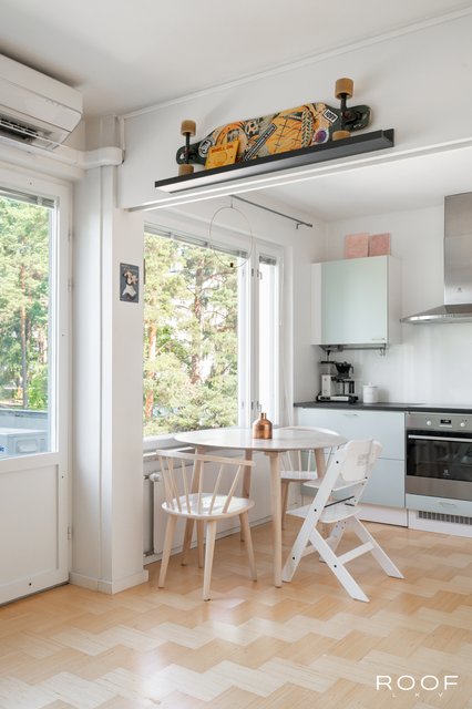 Keittiöön on helppo ihastua: Tapwellin messinkinen hana ja Grohen samansävyinen keittiöallas, niihin sointuvat lankavetimet sekä uusitut kaapinovet ja työtasot kohtaavat käytännöllisyyden sekä 50-luvun hengen. Kodinkoneet ovat modernit ja hyväkuntoiset. Lattiapinta asunnossa on laadukasta Karelian Saima koivuparkettia.