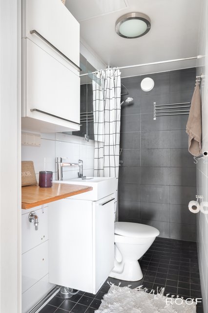- SEINÄT: Laatta LATTIA: Laatta VARUSTELU: Suihku, allas, hana, bidee, allaskaappi, peilikaappi, kiinteä kaappi seinässä.