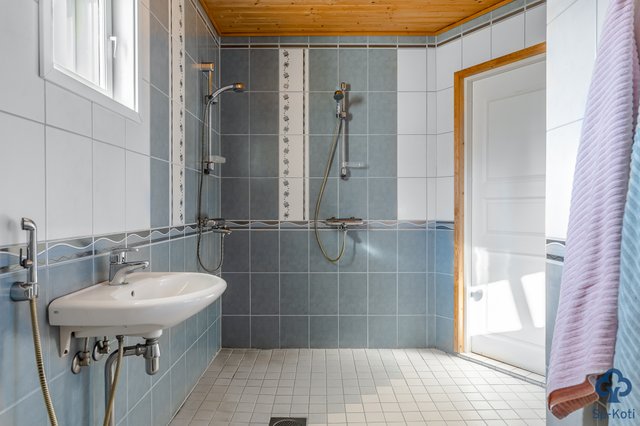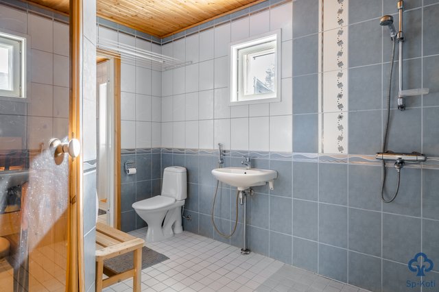 - Kokonaan laatoitettu, lattialämmitys, suihku, pesuallas, wc-istuin.