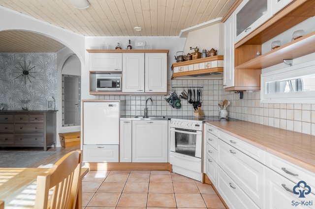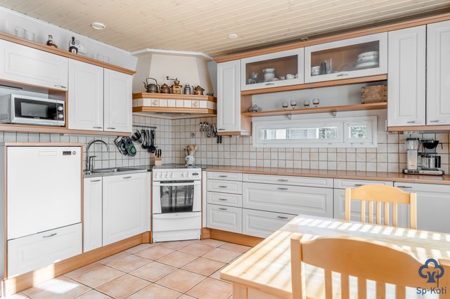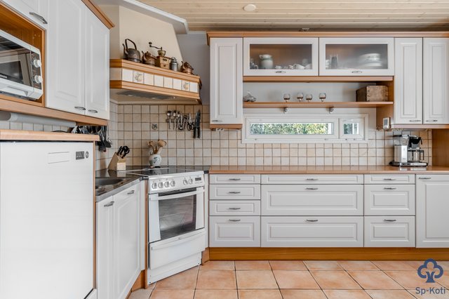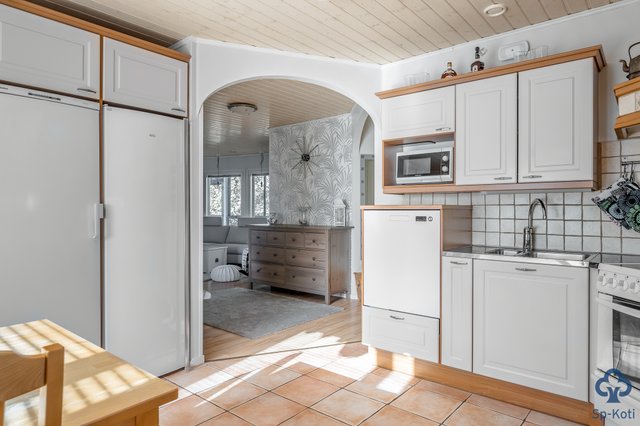 - Kaapistot, jääkaappi, pakastin, astianpesukone, keraaminen liesi, liesituuletin. Laattalattia.