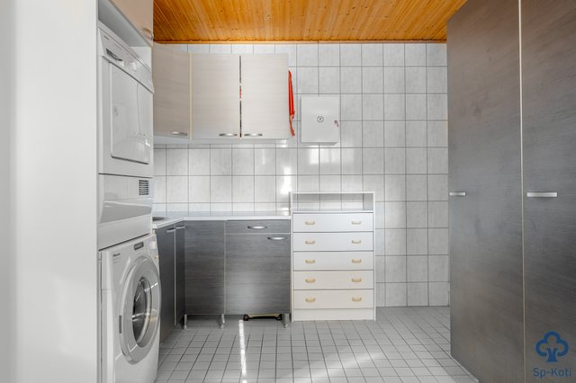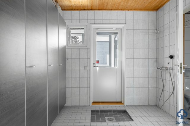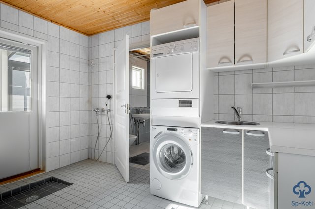 - Kokonaan laatoitettu, kulku ulos, kuraeteinen, kaapistot, pesuallas.