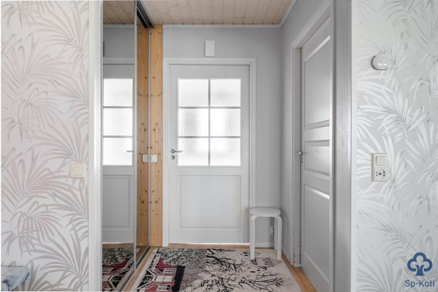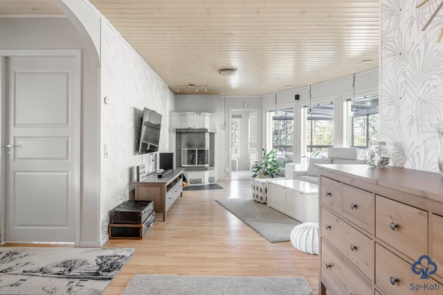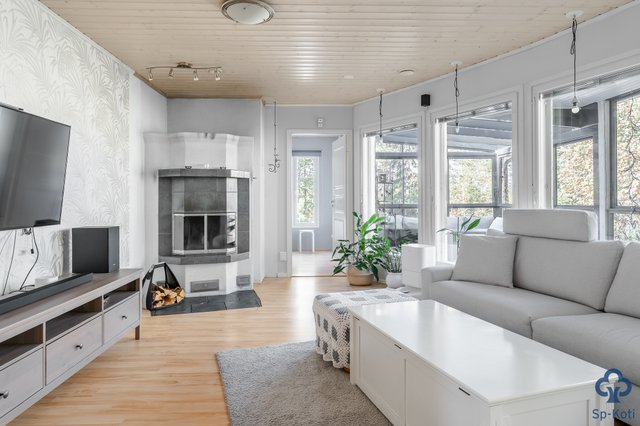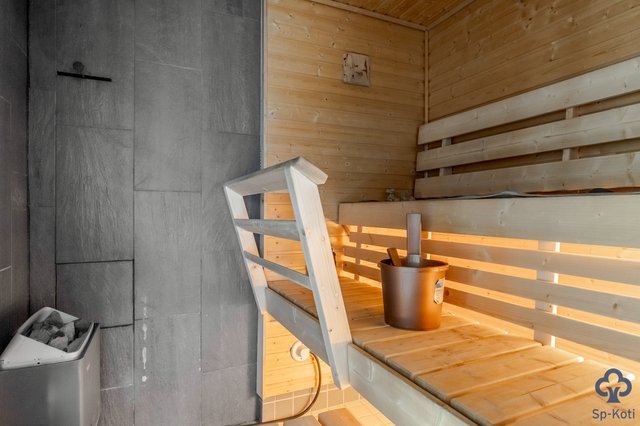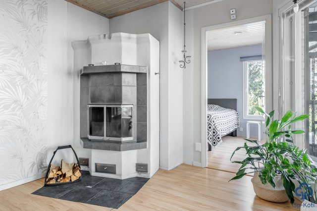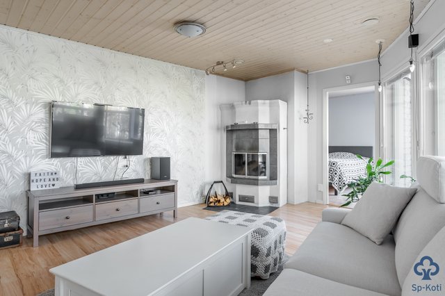 Kodissa on tilava keittiö, jossa on runsaasti kaappitilaa ja nykyaikaiset kodinkoneet. Olohuone on valoisa ja siellä on varaava takka, joka tuo lämpöä ja tunnelmaa. Makuuhuoneita on kolme ja yhdestä on jätetty jo rakennusvaiheessa vaatehuone pois, joten tila toimii hyvin pienelle lapselle tai etätyötilaksi. Kodinhoitohuoneesta on käynti ulos ja se on varustettu käytännöllisellä kuraeteisellä.