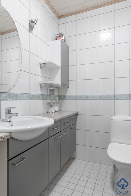 - Kokonaan laatoitettu, pesuallas, kaapistot, wc-istuin.