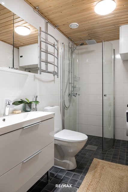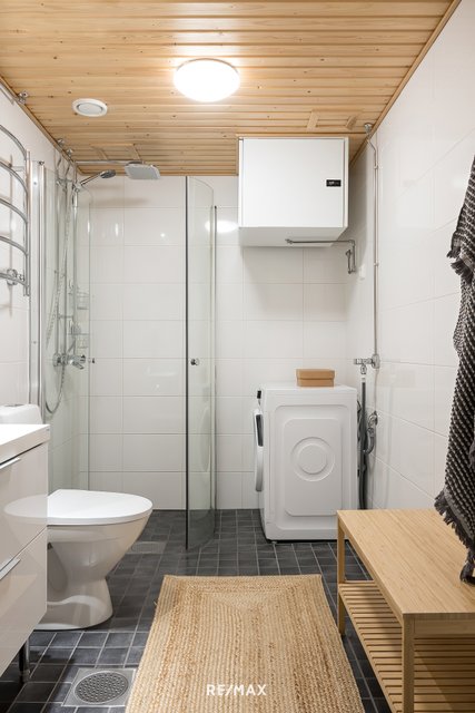 - WC-istuin, suihku, peilikaappi, pesuallas, allaskaappi, pesukoneliitäntä, lattialämmitys, bidee-suihku, ja suihkuseinä