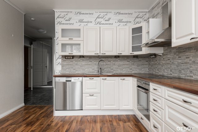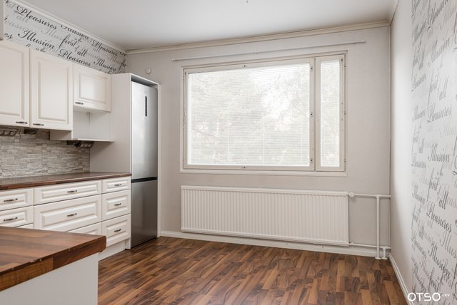 Kaunis keittiö on kyllä tämän kodin sydän ja keittiöön mahtuu isompikin ruokapöytä.